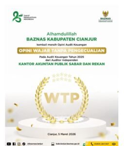 PORTALBELANEGARA.COM//CIANJUR – Badan Amil Zakat Nasional (BAZNAS) Kabupaten Cianjur kembali meraih opini Wajar Tanpa Pengecualian (WTP) atas Laporan Keuangan Tahun 2025. Opini tersebut diberikan setelah melalui proses audit oleh Kantor Akuntan Publik Sabar dan Rekan.