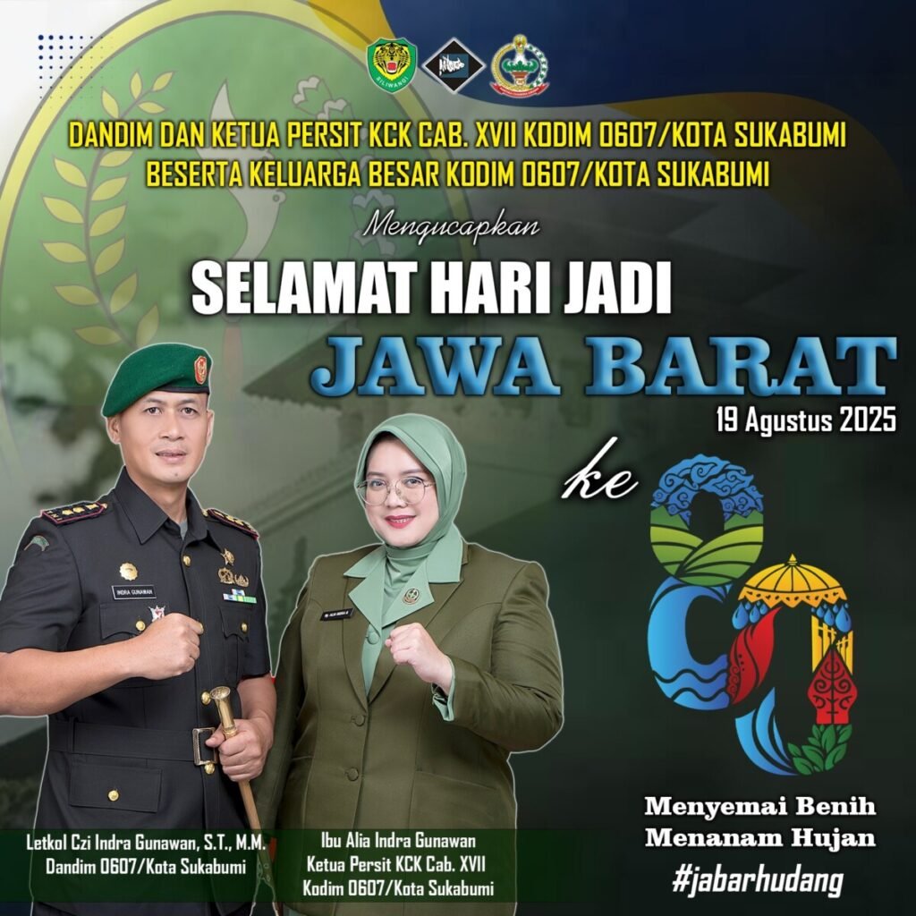 Sukabumi ||Komandan Kodim 0607/Kota Sukabumi, Letkol Czi Indra Gunawan, S.T., M.M., bersama seluruh jajaran, menyampaikan ucapan selamat atas peringatan Hari Jadi ke-80 Provinsi Jawa Barat yang tahun ini mengusung tema “Menyemai Benih Menanam Hujan”. Rabu (20/8/2025)
