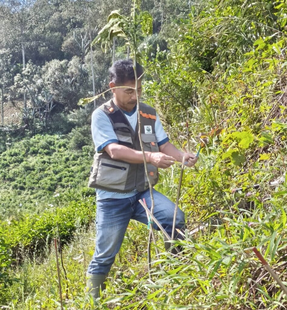 Fokus kegiatan kali ini diarahkan pada pemeliharaan tanaman, meliputi pembersihan rumput liar di sekitar tanaman, perbaikan ajir, serta penguatan kembali ikatan tanaman. Langkah ini dinilai penting untuk menjaga kestabilan tanaman muda agar tidak roboh atau rusak akibat terpaan angin yang kencang, sekaligus memastikan tanaman tetap tumbuh dengan baik.