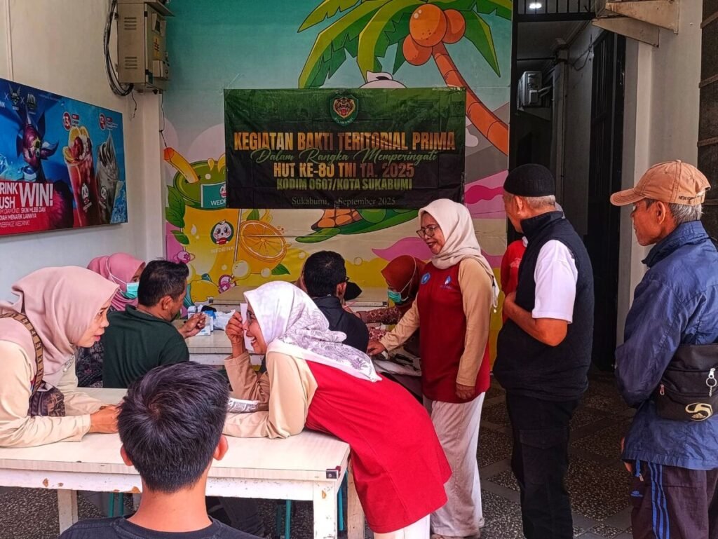 Sukabumi || Dalam rangka menyambut HUT TNI ke-80 tahun 2025, Komando Distrik Militer (Kodim) 0607/Kota Sukabumi menggelar kegiatan bakti kesehatan gratis bagi masyarakat. Layanan kesehatan yang diberikan meliputi pemeriksaan tekanan darah, tes gula darah, asam urat, dan kolesterol.