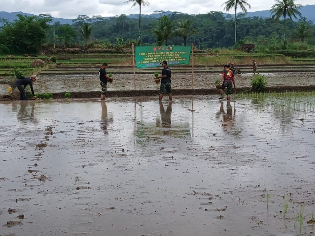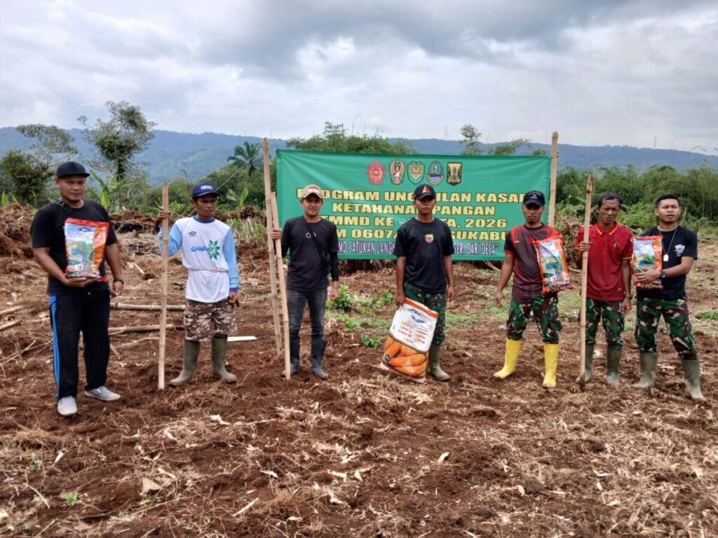 Sukabumi || Program TNI Manunggal Membangun Desa (TMMD) ke-127 yang digelar oleh Kodim 0607/Kota Sukabumi tidak hanya berfokus pada pembangunan infrastruktur, tetapi juga memperkuat ketahanan pangan masyarakat desa. Hal tersebut diwujudkan melalui kegiatan penanaman padi dan jagung di Kampung Ciloa, Desa Parakanlima, Kecamatan Cikembar, Kabupaten Sukabumi, Senin (23/02/2026).